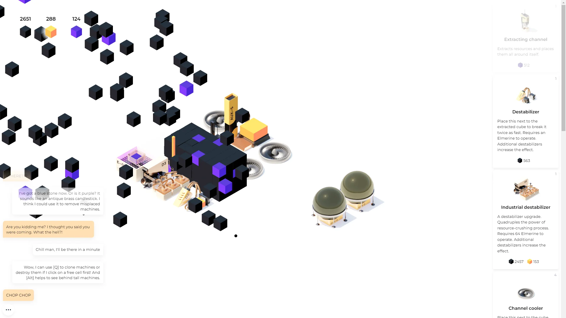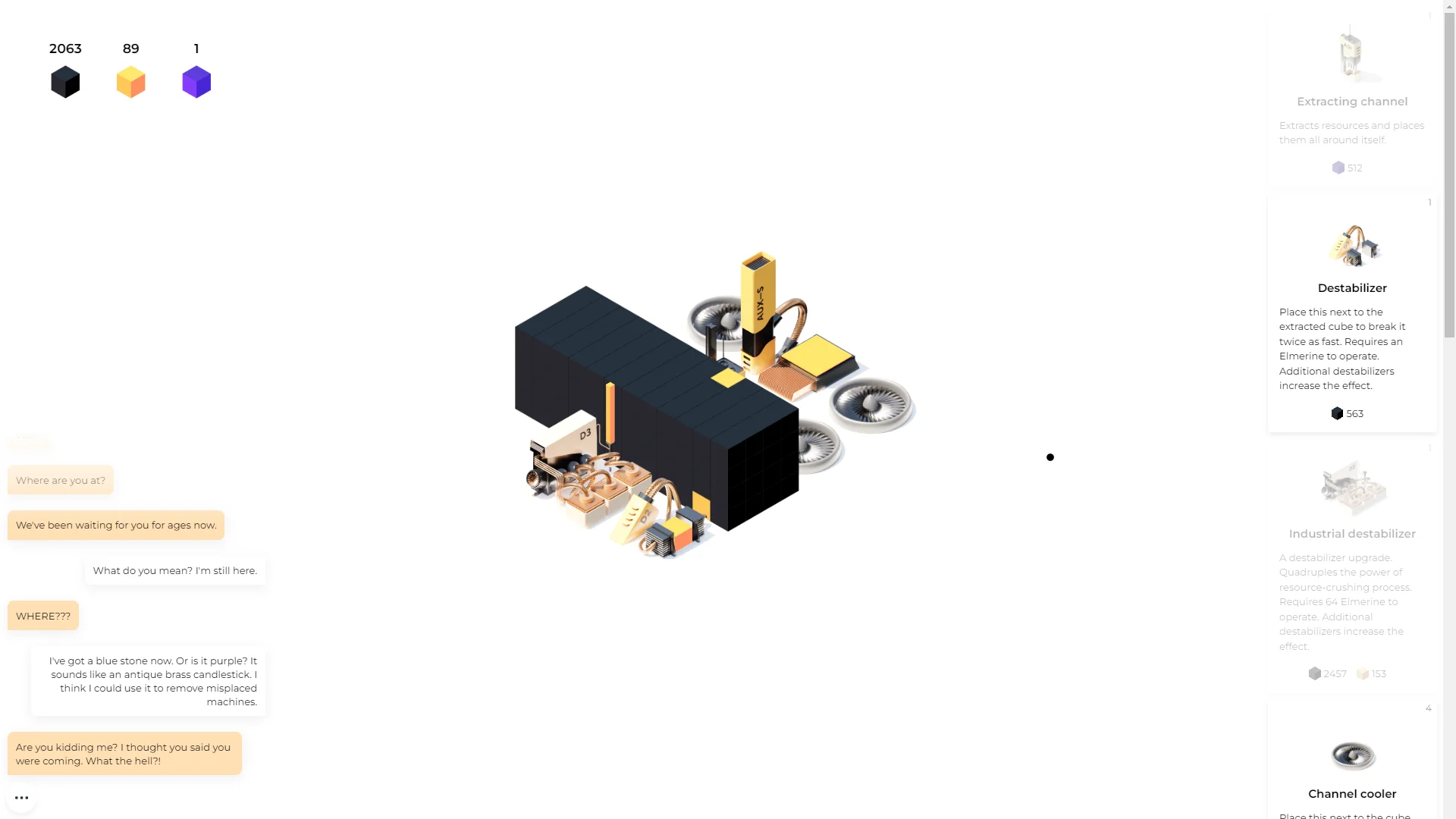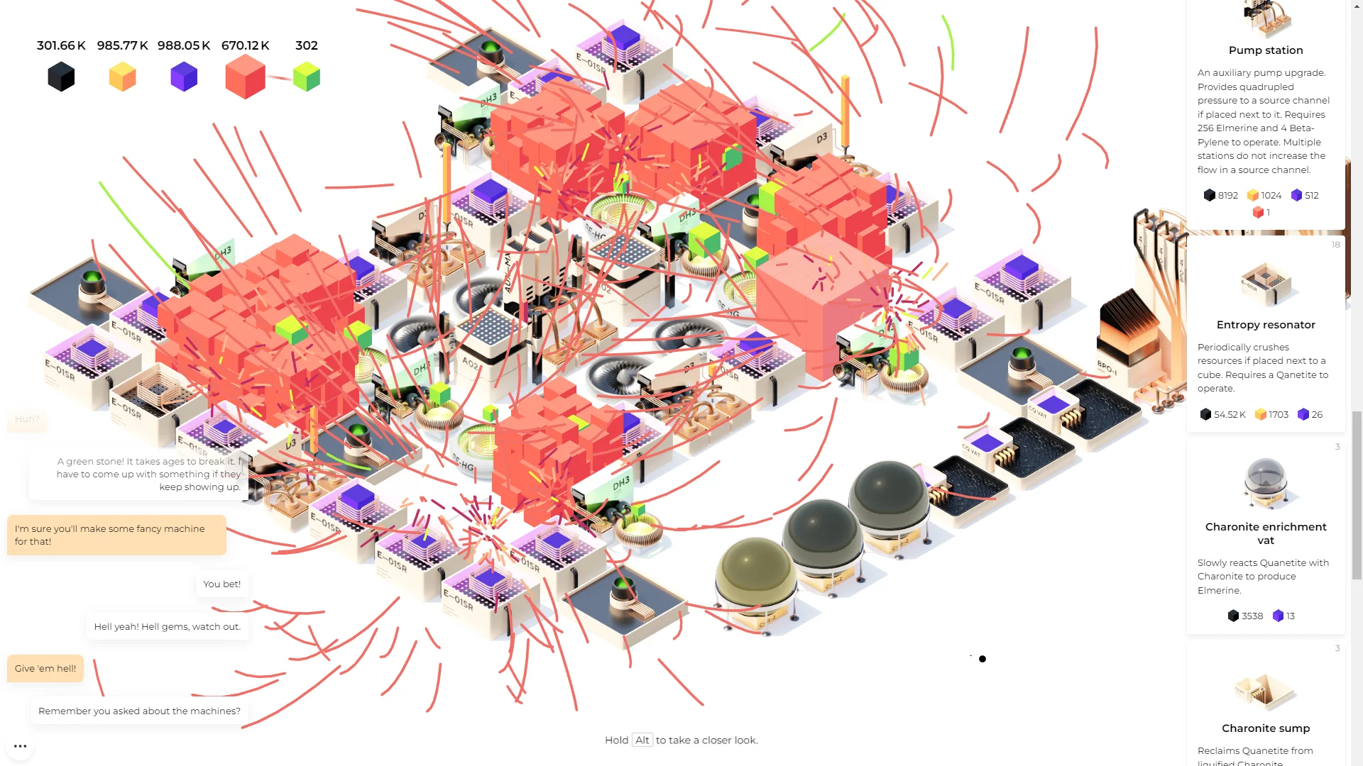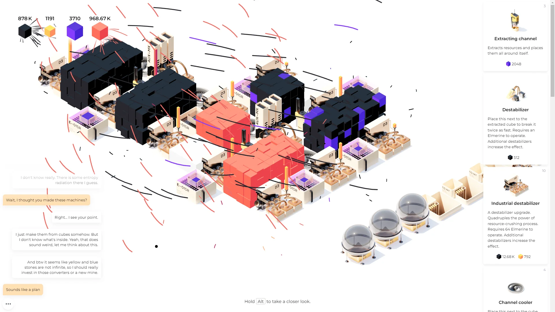 Begin your journey with a simple machine generating distinct cubes. Use combinations of cubes to unlock advanced machinery and new gameplay elements.